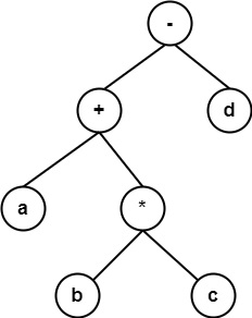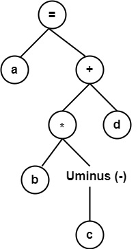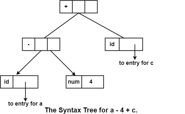 mkleaf (num, val) − It generates a number node with label num and a field including val, the value of the number. For example, construct a syntax tree for an expression a − 4 + c. In this sequence, p1, p2, … . . p5are pointers to the symbol table entries for identifier 'a' and 'c' respectively.